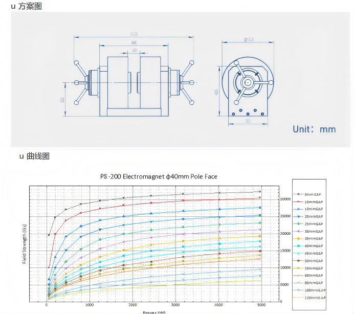 高磁场输出能力:在 5mm 气隙下,中心磁场可达 3.2T@40A(φ40mm 极面);40mm 气隙时仍可实现 1.4T@40A(φ150mm 极面),磁场强度与功率呈良好线性关系。